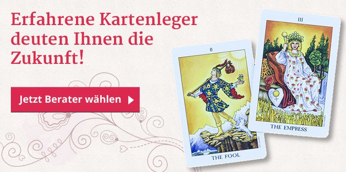 Neugierig auf die Zukunft? Stellen Sie Ihre Fragen erfahrenen und kompetenten Kartenlegern! Jetzt 15 Minuten Gratis testen! >>> Zu den Kartenlegern