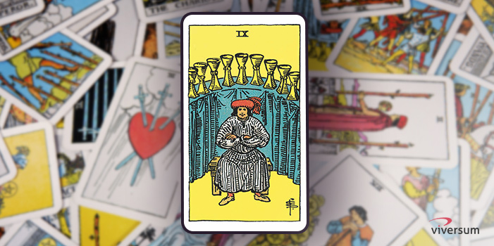 Eine ausgeprägte Symbolik ist oft der Schlüssel zur Erkenntnis, wenn man die Tarotkarten deuten will. Auf der Tarotkarte Neun der Kelche ist ein Mann zu sehen, der mit verschränkten Armen auf einer Bank sitzt und zufrieden dreinschaut. Hinter ihm sind im Halbkreis auf einem Tisch mit blauem Tischtuch die 9 Kelche aufgereiht.