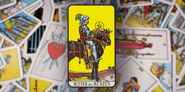 Taucht im Tarot der Ritter der Münzen auf, ist er das Sinnbild für Geduld, Fleiß und Besonnenheit. Als edler Beschützer der Lebensziele zeichnen ihn Eigenschaften wie Tatkraft und Ordnungsbewusstsein aus.